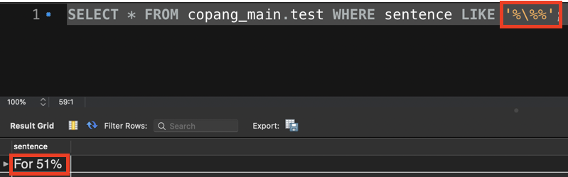 하지만 위 결과를 보니 우리가 예상했던 For 51%만 나온 게 아니라 전체 row가 조회되어버렸습니다. 그 이유는 바로 정가운데 %가 우리가 원하는 '문자로서의 %'가 아니라 'LIKE에서 쓰이는 표현식'으로 간주되어, ‘임의의 길이를 가진 문자열’을 나타내는 것으로 해석되었기 때문입니다.