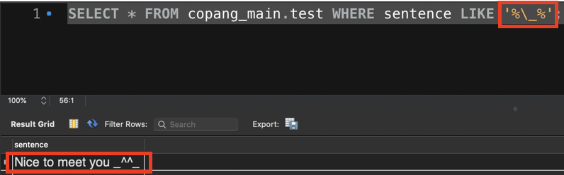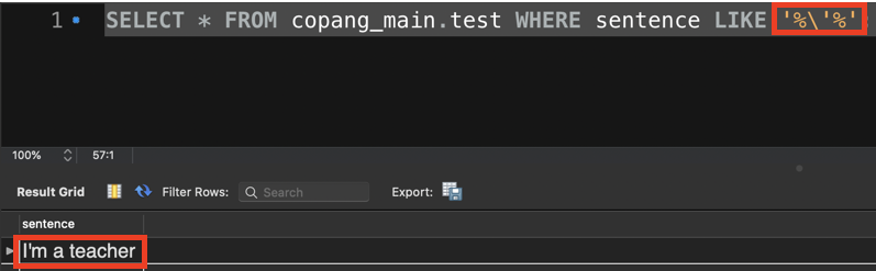 MySQL에서 이스케이핑을 하는 방법은 해당 문자 앞에 역슬래쉬를 붙여주는 겁니다. 다른 것들로도 실험해보겠습니다.