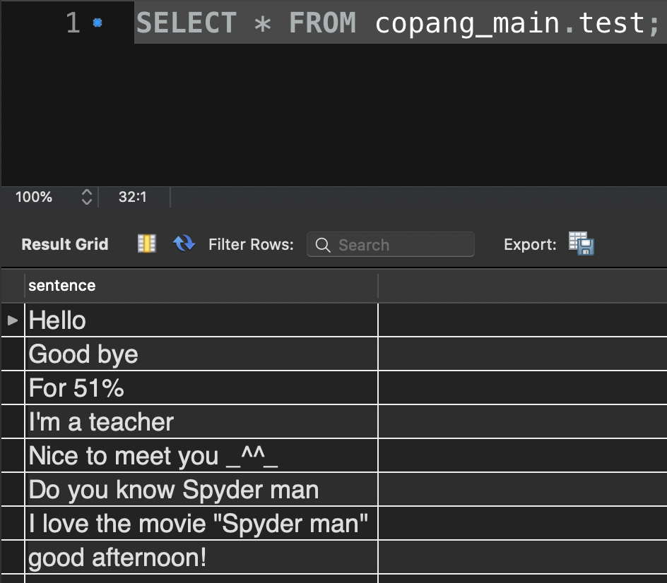 test 테이블 안에는 sentence라는 컬럼 하나가 있는데요. 각 row의 값들을 보면