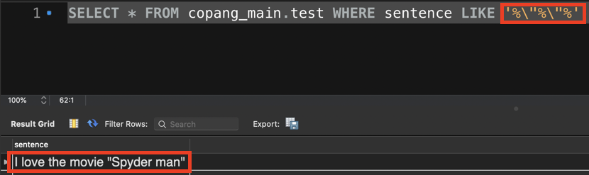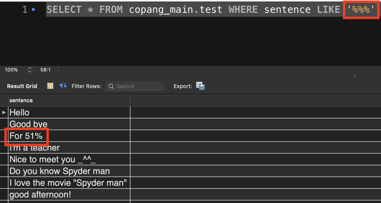 잠깐 이 테이블에서 sentence 컬럼에 퍼센트 기호(%)가 포함된 row를 찾아야한다고 해봅시다.