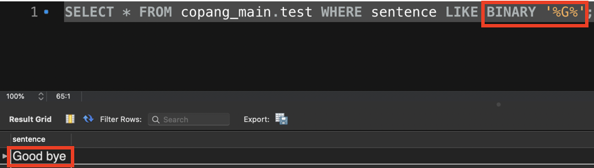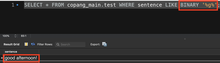지금 %g% 앞에 BINARY라는 단어를 붙였죠? 실행 결과를 보니 소문자 g가 포함된 문자열만 잘 조회되었네요.