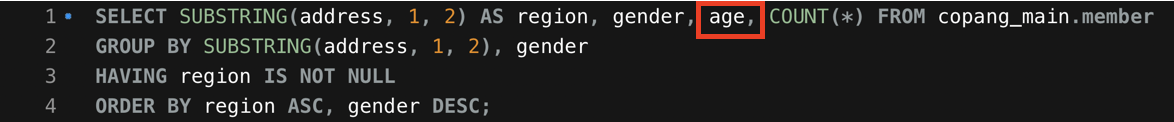 Error Code: 1055. Expression #3 of SELECT list is not in GROUP BY clause and contains nonaggregated column 'copang_main.member.age' which is not functionally dependent on columns in GROUP BY clause; this is incompatible with sql_mode=only_full_group_by