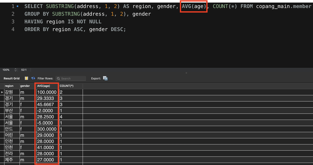 SELECT 절 뒤에 age를 바로 쓰는 건 안 되지만, AVG(age)처럼 집계 함수의 인자로 사용하는 건 괜찮습니다. 왜냐하면 이렇게 하면 각 그룹에서 특정 row의 age 값을 보여주는 게 아니라 그냥 각 그룹 내 모든 row들의 age 컬럼의 값의 평균값을 구하면 되기 때문입니다. 즉, 그루핑 기준으로 사용하지 않은 컬럼이라도 SELECT 절 뒤에서 집계 함수의 인자로는 사용할 수 있는 겁니다.