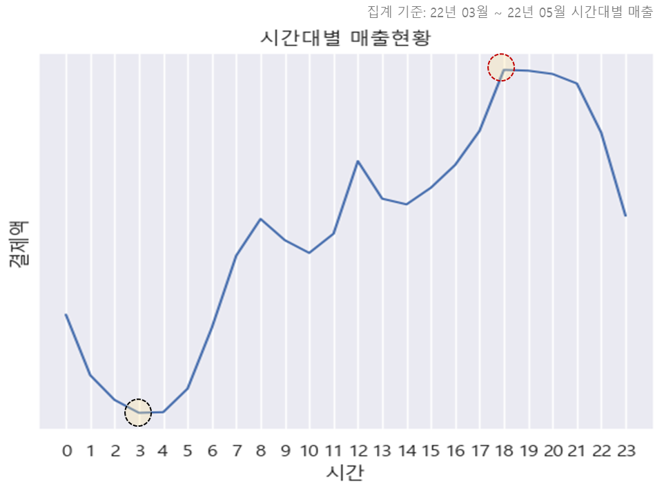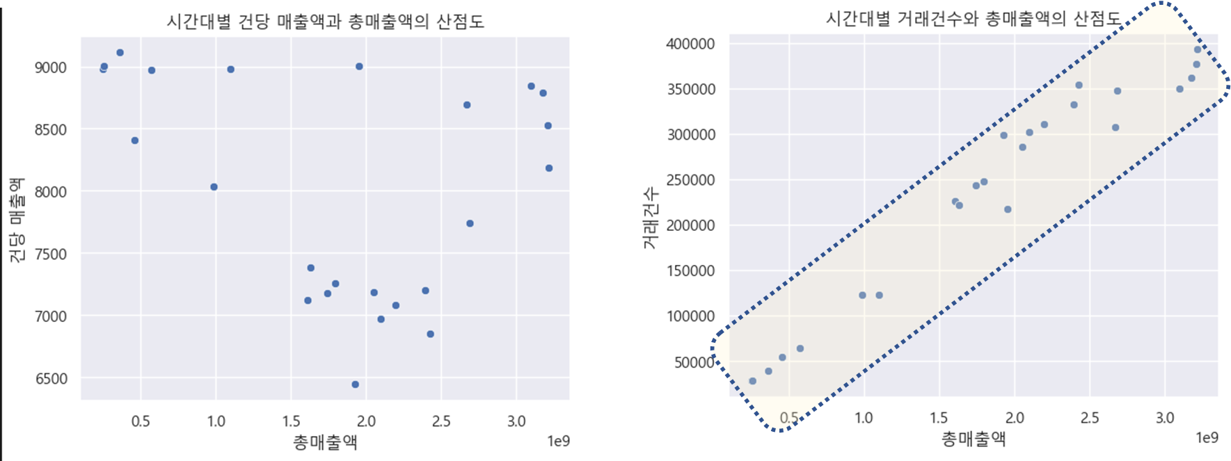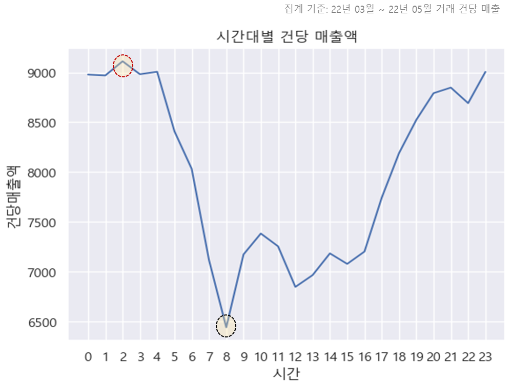· 야간 시간대(22시~05시)가 그 이외의 시간(06~21시)보다 평균적으로 높은 건당 매출액 기록