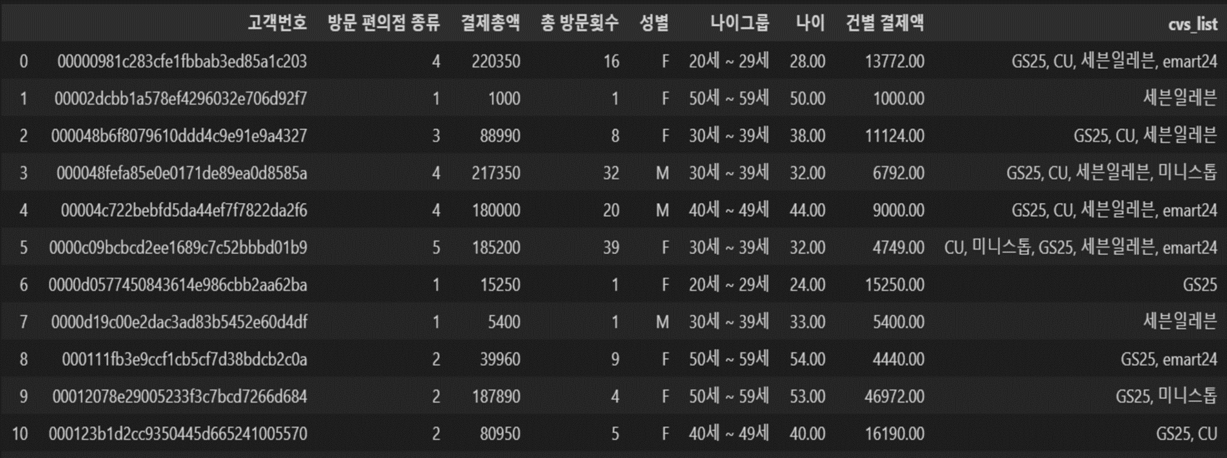 - 고객번호를 토대로 고객 상세 정보를 추출, 그룹별 정보를 토대로 방문 편의점 종류, 건별 결제액 등 파생 데이터 추출