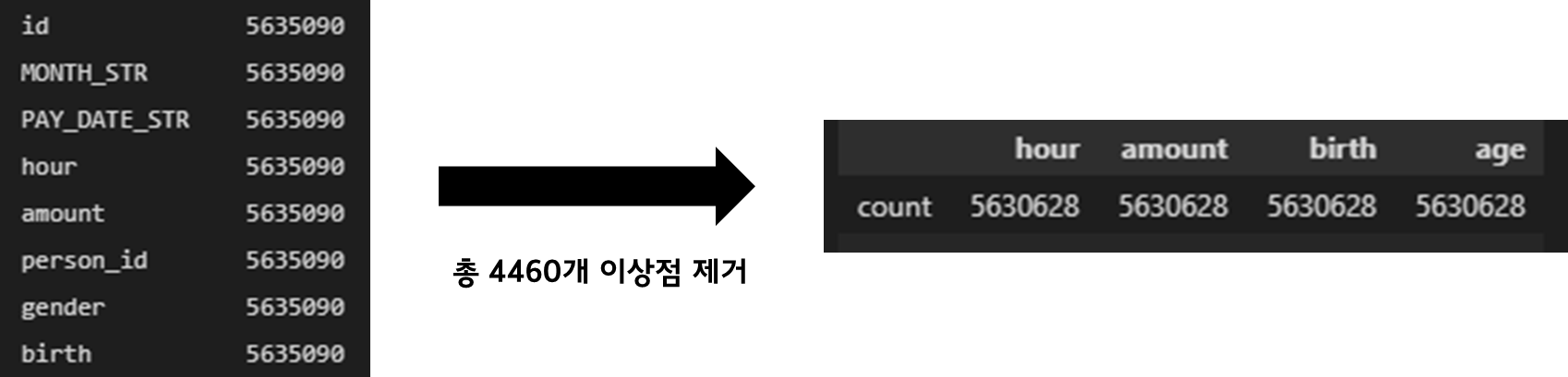 => 결제금액이 200,000 이상이거나, 음수 값일 경우 Outlier로 판단하여 제거