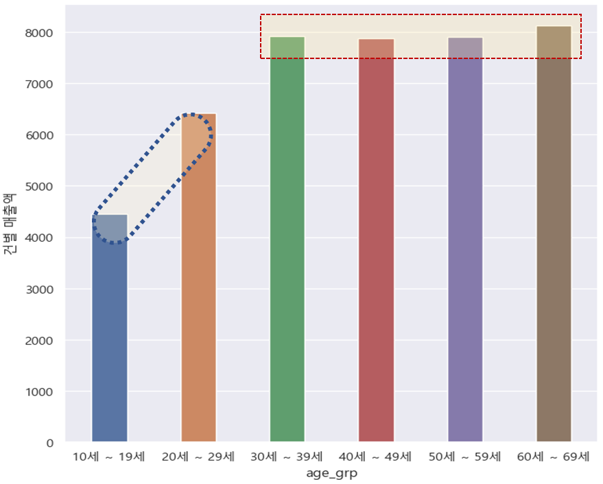 · 30대에서 60대 이상 그룹들의 건당 매출액은 7,800원~8,200원