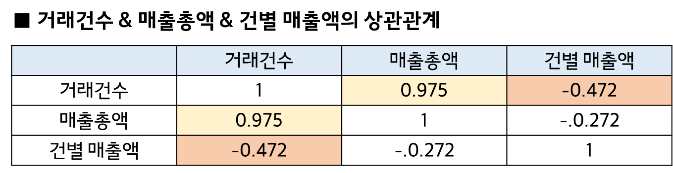 · 거래건수와 매출총액은 양의 상관관계를 가지고 있으며, 거래건수 및 매출총액(그룹1)과 건별 매출액(그룹2)은