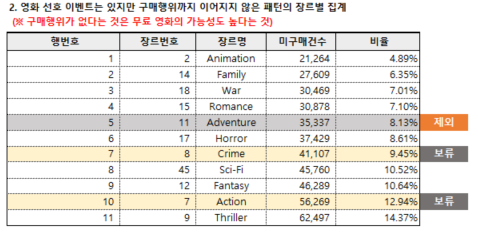 - 고객이 영화에 대해 보인 행동 패턴을 바탕으로, 단순히 탐색한 경우를 제외하고, 구매, 시작, 완료, 평가 중 하나 이상의 행동을 한 경우, 해당 장르에 대한 선호 이벤트로 정의하였습니다. 이를 통해 고객의 실제 영화 소비를 반영하고, 선호도를 추정할 수 있었습니다.