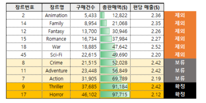 애니메이션, 가족, 판타지, 전쟁, 로맨스, 공상과학 등 6개의 장르는 구매건수와 총판매액이 낮았기 때문에 모델 대상으로 적합하지 않다고 판단하여 제외했습니다.