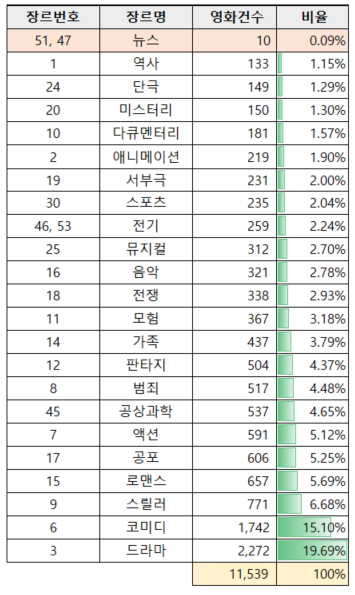 스포츠, 전기, 뮤지컬, 음악, 단편극, 미스터리, 역사, 서부극, 다큐멘터리 등 9개 장르는 이벤트 건수가 5만 건 이하로 매우 적어서 제외되었습니다.