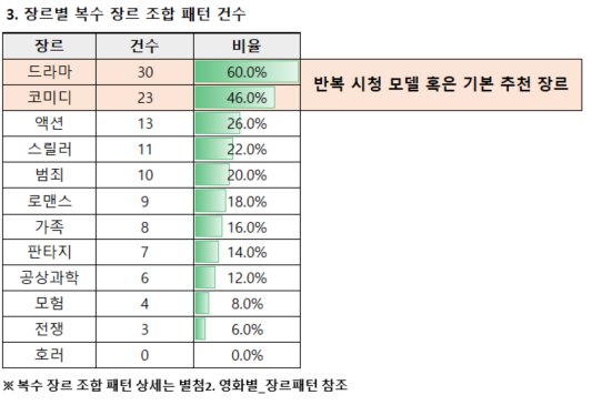 그러나 장르에 대한 선호도는 단순히 탐색에 그치는 것이 아니라, 고객이 해당 영화에 대해 더 적극적인 행동을 보였는지를 기준으로 파악해야 한다고 판단하였습니다. 이에 따라, 탐색을 제외한 모든 활동을 단 한 가지라도 수행한 경우, 해당 영화를 선호하는 것으로 가정하였습니다.