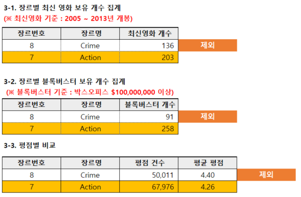 최신 영화 보유 수와 블록버스터 영화 보유 개수 역시 중요한 기준이었습니다. 범죄 장르는 최신 영화나 블록버스터 영화 보유 개수가 적었기 때문에 제외되었습니다.반면, **액션(258개 블록버스터 보유)**과 공포, 스릴러는 최신 영화 및 블록버스터 보유 수가 높아 최종 타겟 장르로 채택되었습니다.