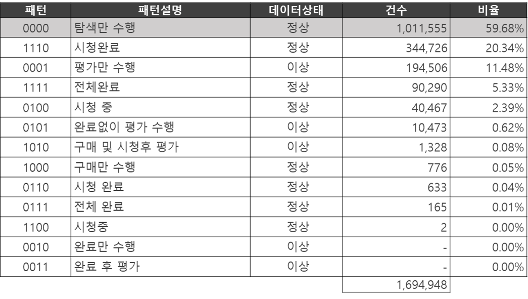 구매여부 || 시작여부 || 완료여부 || 평점여부 as 행동패턴